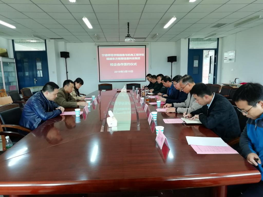 2019年3月15日下午,由福建东方锐智信息科技集团与信息与机电工程公司共同举办的校企合作签约仪式暨实训教学基地挂牌仪式在公司会议室顺利召开。东方锐智集团总经理黄新东,副总经理陈燕萍,软件开发部副经理郑喜代表,公司副董事长兼信息与机电工程公司经理谢向东,公司党委书记陈茂和,副经理章立亮,党委副书记傅亮,副经理赖联锋,校企合作中心主任梁国祥,计算机系主任杨烈君,电子技术教研室负责人王辉出席会议。
