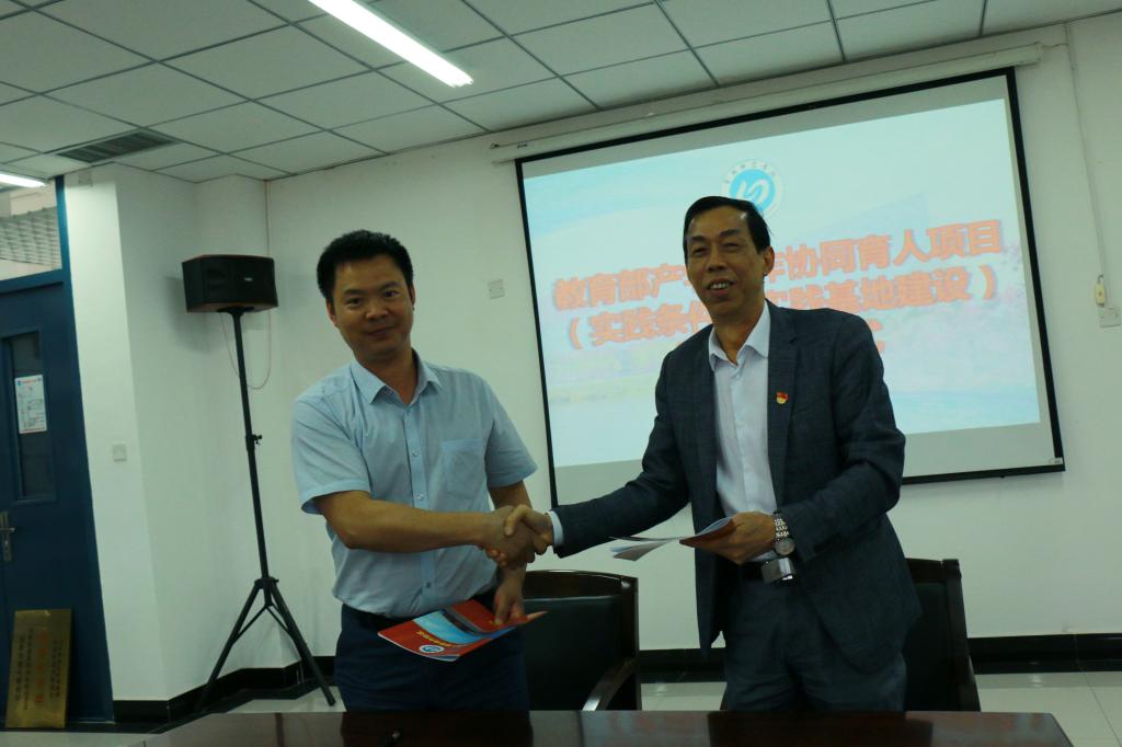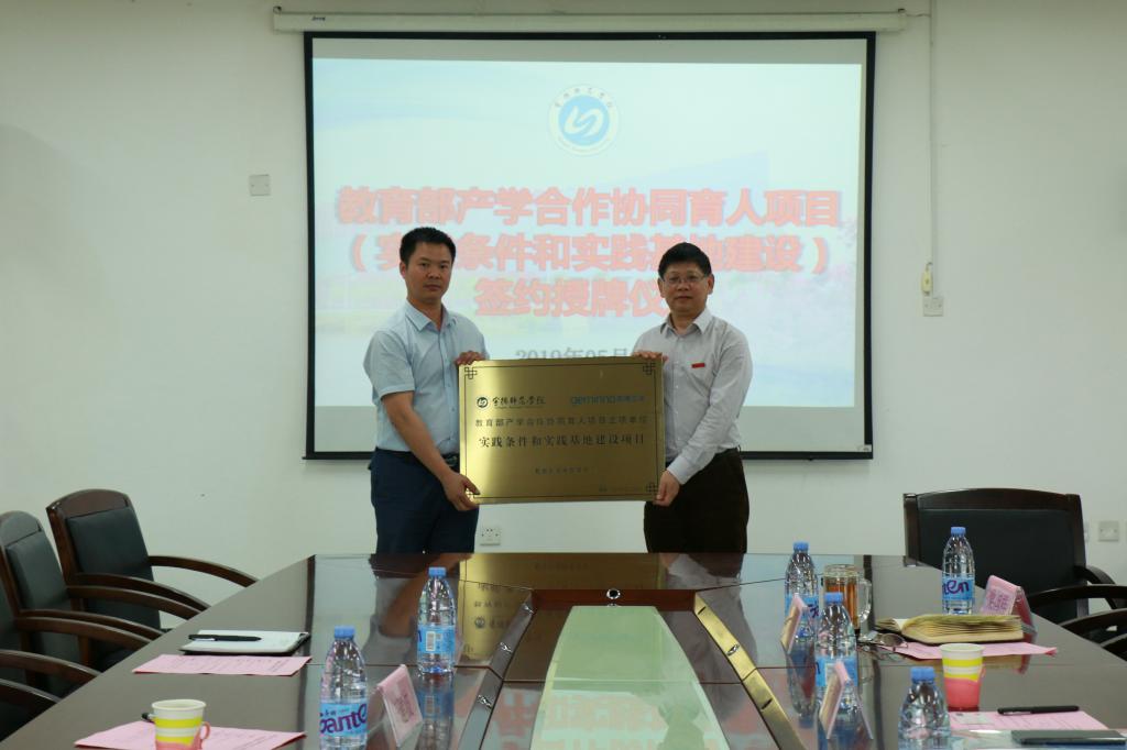 公司党委书记陈茂和与高博应诺副总经理陈建波分别代表校企双方进行签约,由苏州高博应诺为公司授牌“教育部产学合作协同育人项目立项单位实践条件和实践基地建设项目”,双方合影留念。
