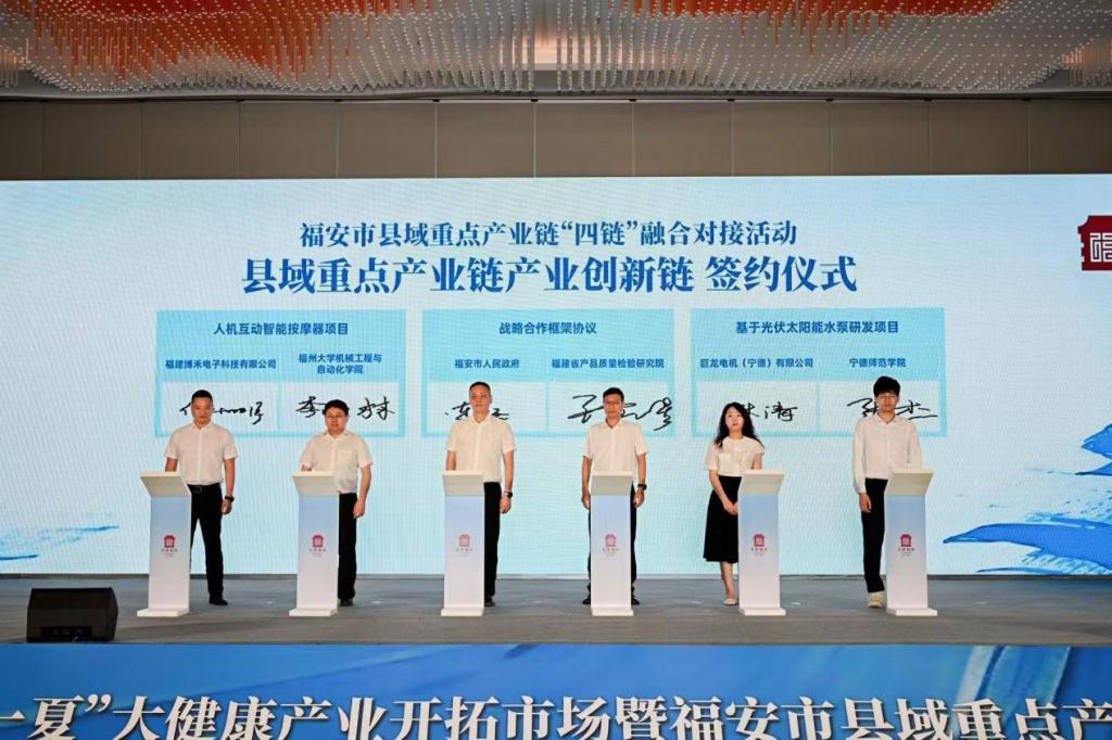 6月6日,“全家福安・健康一夏”大健康产业开拓市场暨福安市县域重点产业链“四链”融合对接会在东百假日酒店举行。此次活动由福安市政府牵头,聚焦电机电器、不锈钢等重点产业链,以“产业链、创新链、资金链、人才链” 四链融合为核心,旨在通过政产学研用协同创新,破解产业技术瓶颈、拓展市场发展空间。公司张杰老师代表院方出席,在县域重点产业链产业创新链签约仪式上,与巨龙电机(宁德)有限公司就“基于光伏太阳能水泵研发项目”完成产学研合作签约。该项目既助力福安市电机电器产业与高校创新资源深度融合,为产业创新发展注入新动能,又推动公司团队建设与地方产业需求深度适配,促进“产教融合”人才培养模式深化。