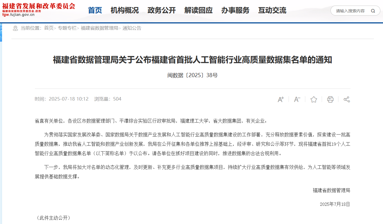 福建首批人工智能行业高质量数据集名单