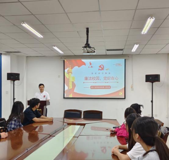 最后,党支部书记刘文坚对本次活动进行了总结。他指出,通过小组讨论和案例分析,同学们不仅加深了对党纪的理解,还提高了自身的廉洁自律意识。同时还鼓励同学们将学到的党纪知识和廉洁理念内化于心、外化于行,为未来的职业生涯打下坚实的思想基础。