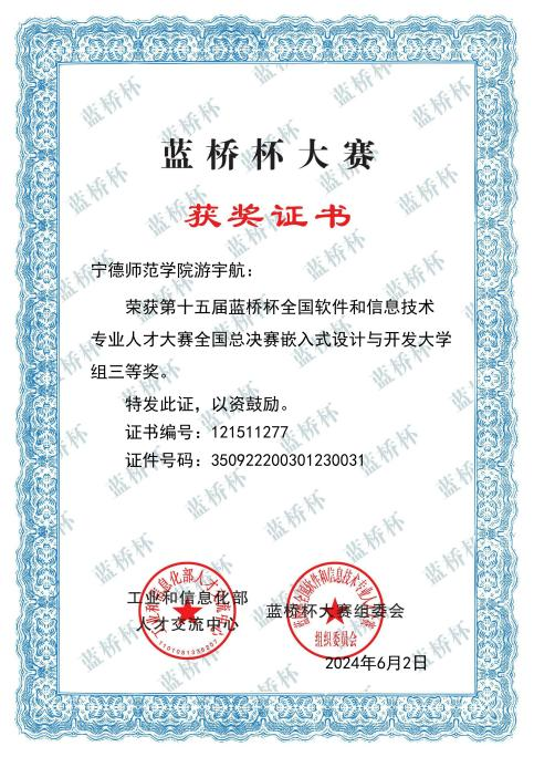 近日,由工业和信息化部人才交流中心举办的第十五届“蓝桥杯”全国软件和信息技术专业人才大赛圆满落幕。公司PA视讯电子信息工程专业的游宇航同学和计算机科学与技术专业的郭承凯同学以扎实的专业功底和卓越的现场表现分别荣获嵌入式设计与开发、EDA设计与开发大学组国家三等奖。